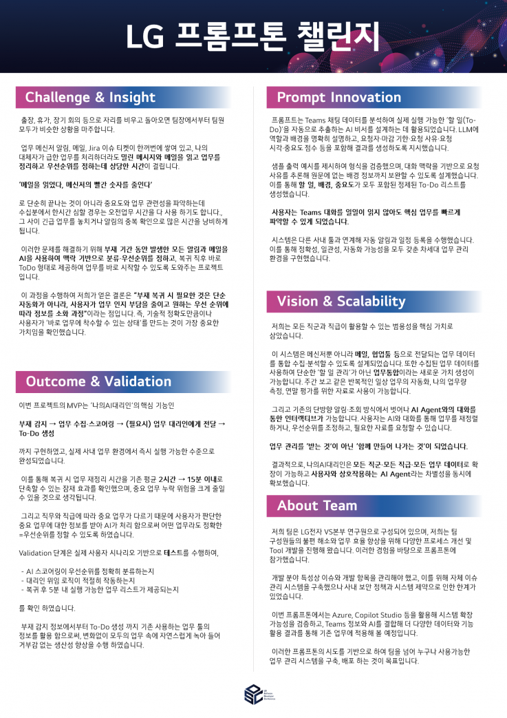 | 프롬프톤 챌린지 우수상 | 오아싀스 | 김진영, 김민정, 김정민 | LG전자 |